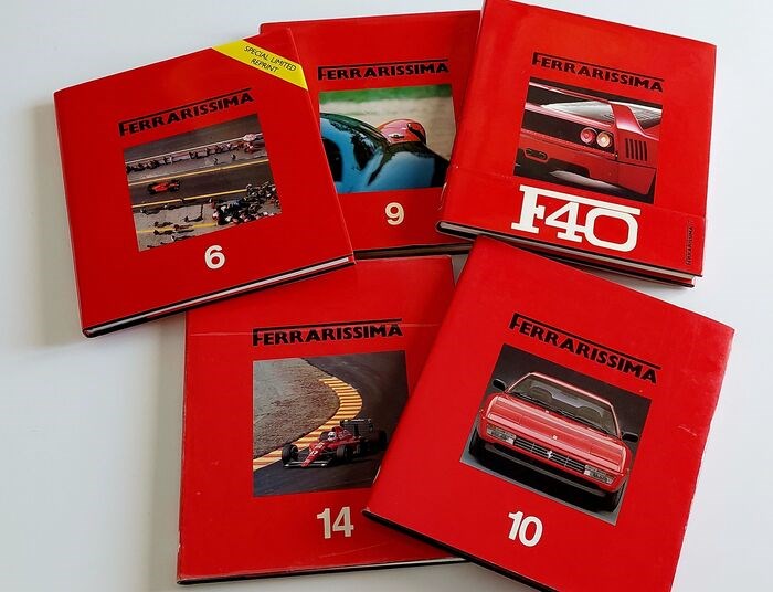 Boeken Ferrarissima nummers 06/07/09/10/14 zeldzaam en prestigieus tijdschrift gemaakt in slechts 5000 exemplaren per nummer, jaren 80, alle nummers behalve nummer 6 hebben hun bijlagen van gebruiks- en onderhoudsboekjes tot posters en motorprojecttabellen.