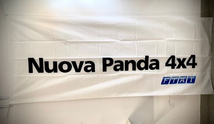 Nieuwe Panda 4x4 vlag, afmetingen 250x102, nieuw origineel gereserveerd voor dealers. Alleen voor de foto's uit de tas gehaald, geen vlekken of scheuren en de stof is zacht en glanzend. Het schrift is aan beide kanten, hangen heeft een mooie visuele impact. Mis het niet, goed bieden!