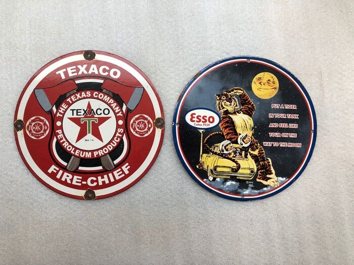 2 emaille reclameborden voor Amerikaanse olie en brandstof producten :