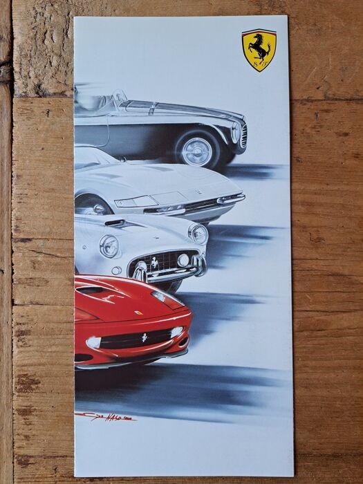 Great Ferrari 550 Barchetta Pininfarina sales brochure with beautiful drawings from the Ferrari models 166 MM, 250 California and 365 GTS4 Daytona from the 1950's until the 1970's. All pages are on the pictures.