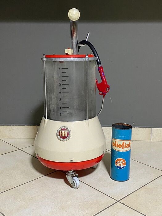 FIAT oliezuigkolom, afkomstig uit een oude werkplaats. De zuigpomp is in werkende staat, hij heeft 380v stroom nodig, aangezien hij erg gedateerd is.