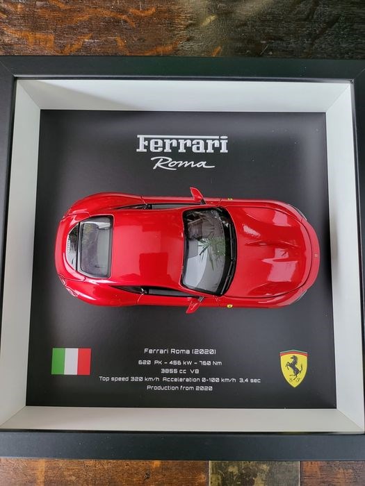 Model Ferrari ROMA (2020) in de schitterende nieuwe Ferrari rode kleur, op schaal 1:24 (modelauto is nieuw) in 3D frame