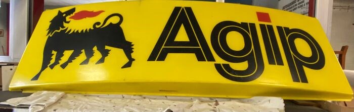 Een prachtig bewaard gebleven giga groot oud Agip lichtreclamebord/front met wat patina, een enkel klein scheurtje en twee breuken op de rand. Zie foto’s. Van dichtbij valt het op, maar vanaf afstand niet.