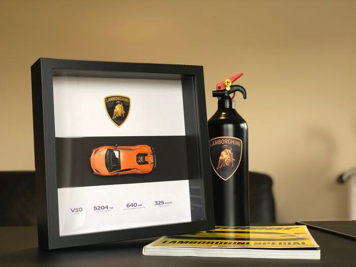 Kader gebaseerd rondom een 1/43 schaalmodel - Lamborghini Huracan Performante in arancio borealis. In het item zijn ook het ‘Lamborghini’ logo en enkele unieke specificaties van deze sportwagen verwerkt.