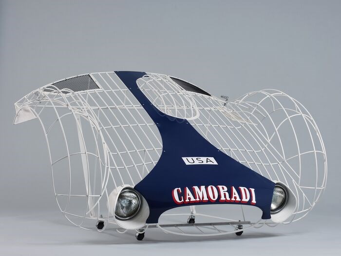 Replica van wit geëmailleerd staal van het voorste deel met draadframe van de Maserati Birdcage Camoradi, volledig met de hand gemaakt in Modena in de Allegretti carrosserie onder toezicht van Giancarlo Guerra (Scaglietti). Een stuk. In geval van niet-afhalen thuis in Milaan, vanwege de bijzonderheid van het object, zal een verzendmethode naar keuze en op kosten van de koper moeten worden overeengekomen.