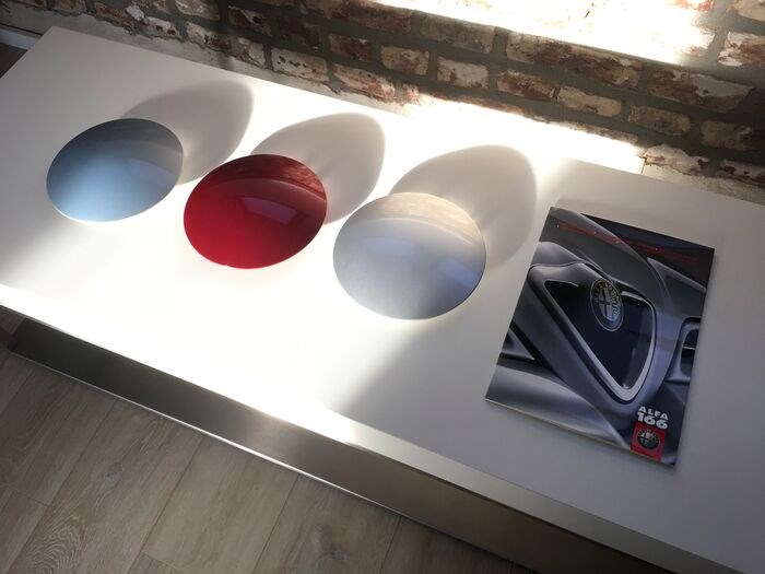 Deze prachtige Alfa Romeo-kleurplaten hingen in een voormalige Alfa Romeo-dealer en tonen kleuren van het toenmalige vlaggenschip van het merk, de Alfa 166.