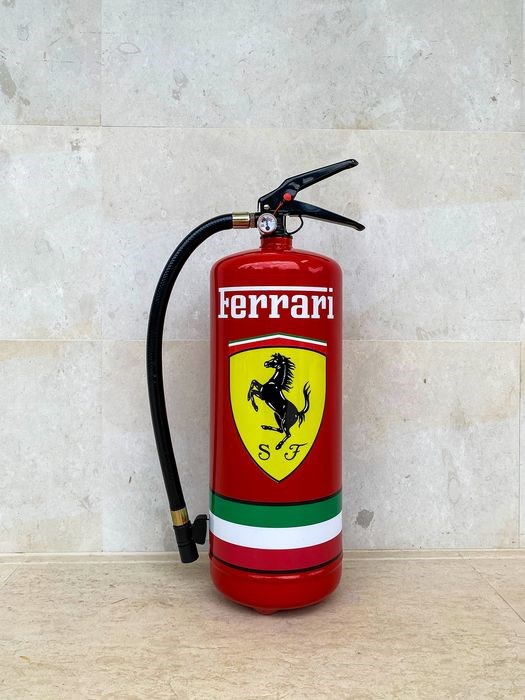 Gloednieuw, volledig functionerend en geladen met 6 kg ABC-brandblusser voor droog poeder, getransformeerd in een uniek decoratief stuk dat ook kan worden gebruikt zoals bedoeld.