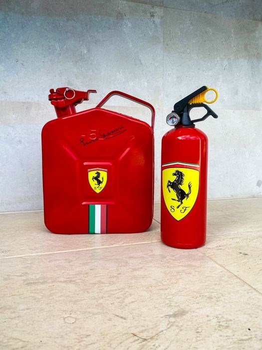 Set van een gloednieuwe, volledig functionerende jerrycan van 5 liter en een gloednieuwe, volledig functionerende en geladen met 1 kg ABC-brandblusser voor droog poeder, omgevormd tot unieke decoratieve stukken die ook kunnen worden gebruikt zoals bedoeld.