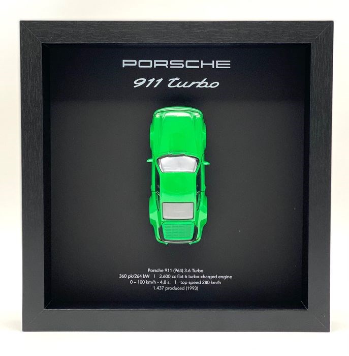 3D shadow box containing a Porsche 911 (964) 3.6 Turbo 1993 green (signal grün)