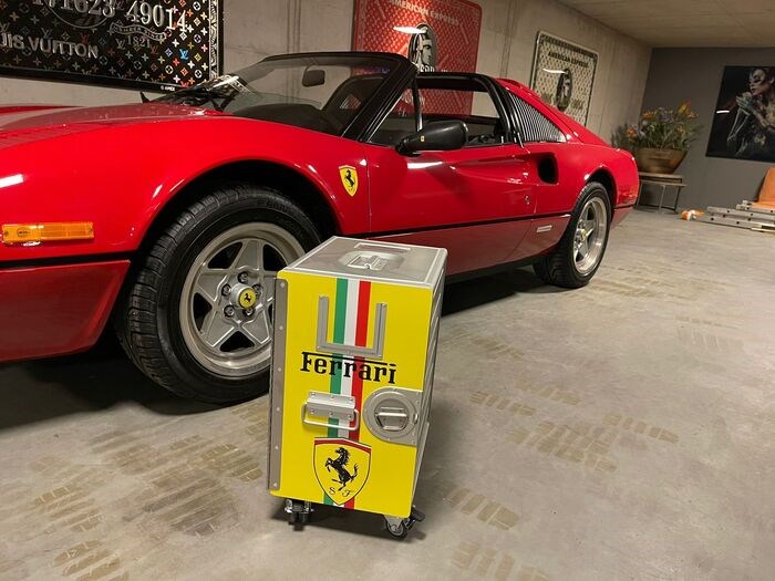 De XL-unit met wielen is gemaakt van een originele nieuwe galley container van origineel formaat en door ons ons voorzien van een full colour Ferrari print.