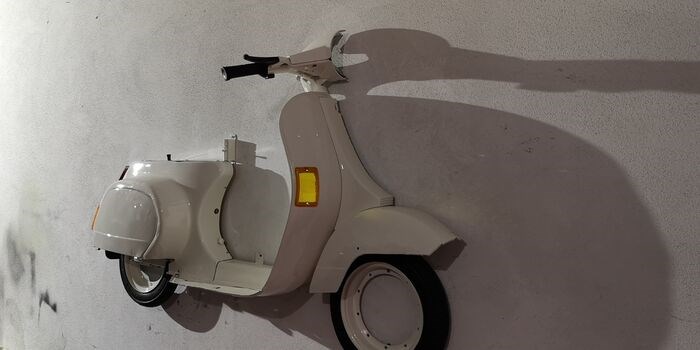 Vespa wanddecoratie met plank, lade en tafel in één. Artistiek stuk gemaakt met originele stukken.