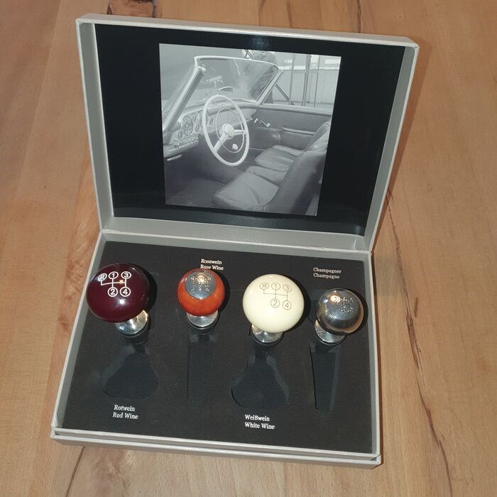 Vierdelige set wijnflesstoppers in de vorm van een 300-SL versnellingspook (2maten).