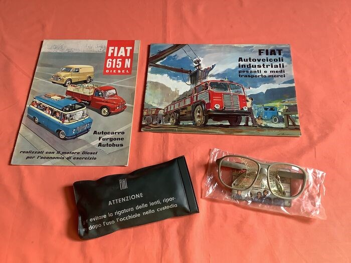 Brochure voor fiat 615, 682 N, 642 N vrachtwagens uit de jaren 50 in goede staat, moeilijk te vinden, uiterst zeldzame FIAT veiligheidsbril uit de jaren 50/60, nieuw in de originele verpakking die bij de Fiat vrachtwagens zat, veilige verzending per koerier
