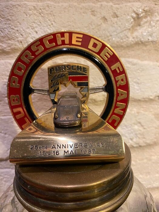 Zeer zeldzame Badge trofee in messing en rood emaille met het bekende stuur van de Porsche 356 B,C in het midden met in het midden een Porsche 911 3.2 1987 in brons die de badge kruist op een trofee voor 25 jaar Porsche Club uit Frankrijk vervaardigd door hoffelijk in parijs en ontworpen door THE DESIGNER Max MALKA
