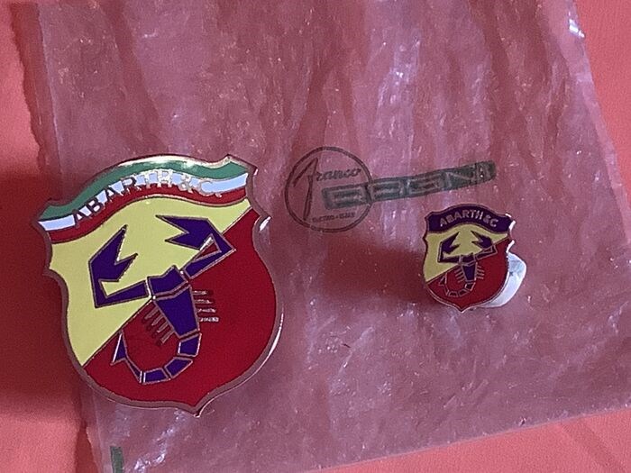 Spectaculaire officiële abarth-emblemen uit de jaren 50/60, eerste merk in verchroomd messing, heet geëmailleerd (oud proces), gebruikt maar met een prima vintage look (NB. Het grote embleem heeft een teken van veroudering in het rode gedeelte maar heeft geen invloed op de vintage look). Ze komen uit het oude pakhuis. van de destijds erkende fabrikant, misschien als voorbeeld gebruikt, er is ook de originele tas met het grote embleem