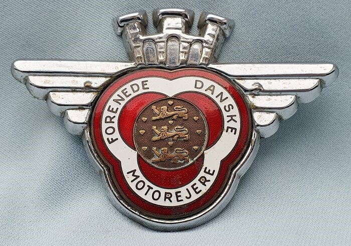 Geëmailleerde Grille Badge van de "Forenede Danske Motorejere" (Federatie van Deense Automobilisten) uit de 60/70er jaren schat ik.