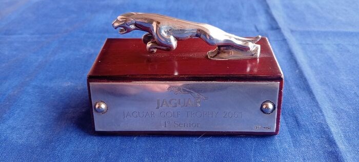 Golftrofee met afbeelding van de jaguar van de legendarische Jaguar-trofee uit 2001 in 925 zilver zoals de klassieke golftrofeeën, afmetingen 5,5 x 4,5 x 9,0 cm, in perfecte staat.