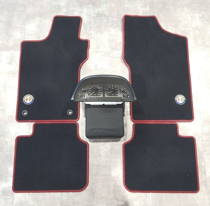 Voor Alfa Romeo 155 origineel Veglia knipperlichtpaneel, 4 replica matten met rode randen en embleem gestikt op bestuurders- en passagierszijde matten en autobandencompressor.