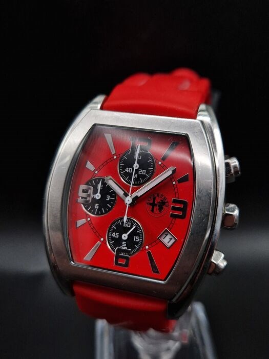 Zeldzaam ALFA ROMEO chronograaf horloge met stalen kast en rode rubberen band.