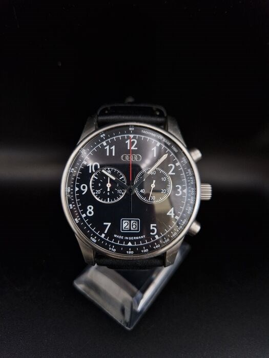 Prachtig Audi chronograaf horloge met stalen kast en zwart leren band met witte stiksels. Het quartzhorloge is gemaakt in Duitsland.