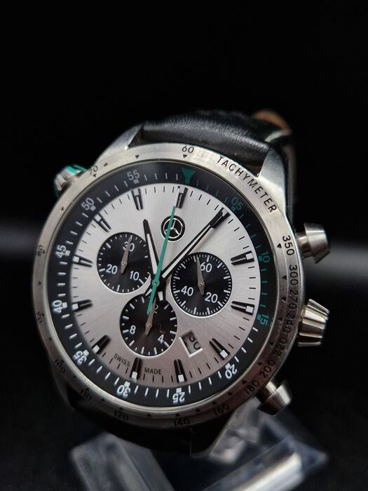 De wijzerplaat van het horloge is zilver en heeft zwarte en Petronas groene accenten. De band van het horloge is van zwart leer gemaakt en heeft lichte gebruikssporen. .