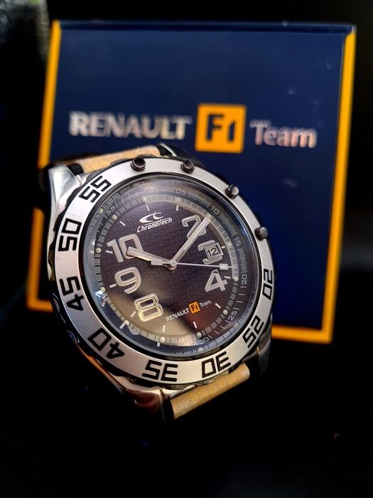 Prachtig Renault F1 team horloge met een zwarte witte kleurstelling uit 2012. Het horloge heeft de originele beige leren band met zwarte accenten die de looks van dit mooie horloge helemaal compleet maakt. Het horloge wordt geleverd in de originele Renault F1 doos van Chronotech. Daarnaast worden ook de bijhorende boekjes geleverd.