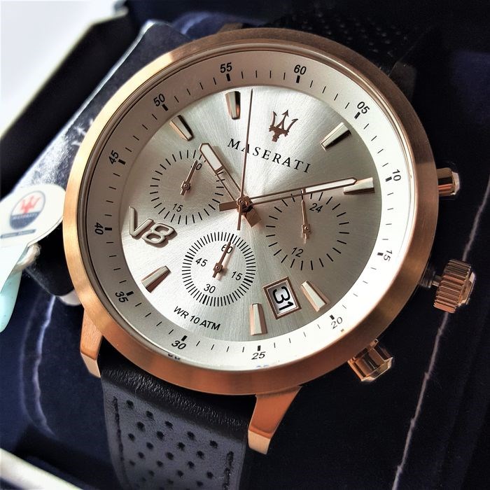 Het heeft een datumfunctie, 24-uursfunctie en een chronograaf. Stijlvolle speciaal lederen band, met gladde gaatjes aan de bovenzijde en een stevige onderzijde. 18K vergulde kast.