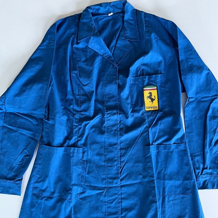 Er wordt geveild een officiële Ferrari-monteurswerkjas in maat L, uit GT-productie, die dateert uit de jaren 80, toen overalls nog blauw waren.