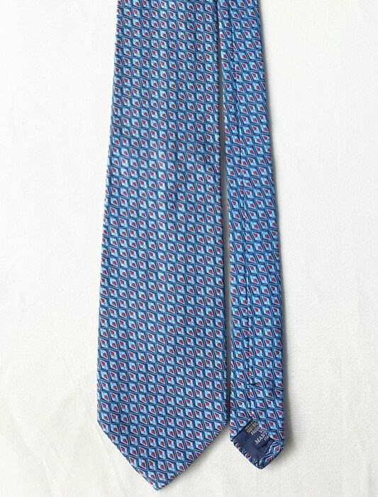 Elegante blauwe stropdas van Ettore Bugatti met lichtblauw en rood geometrisch ontwerp.