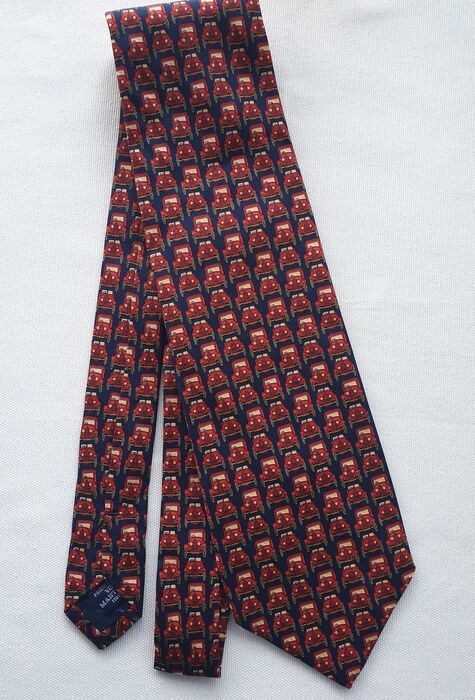 Elegante Ettore Bugatti donkerblauwe stropdas met rode kleine autootjes.