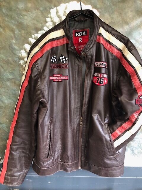 Pracht cabrio of motorjas merk Rednick stevig bruin leder met rood witte striping op mouwen. Voorzien van Daytona Circuit Speed Limited en 2 Finishvlaggen en Raceteam 76 badges op voorzijde.Uitgerust met 2 steekzakken en 1 binnenzak. Nette zwarte voering met RDK Rednick Industrie merk logo.