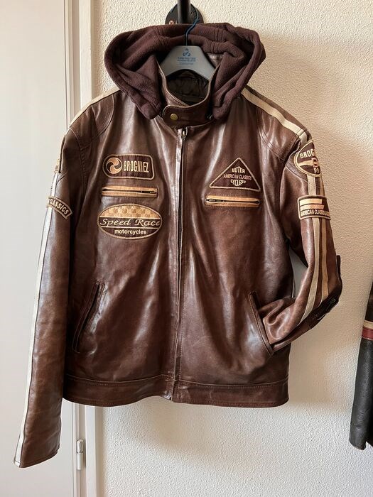 Bruine caféracer, motor of leren jas met originele afritsbare hood van Superior New York met badges van Brogniez 99 series, Speed Race Motorcycles, American Classics Motor Cycles, Nr 117. Niet meer verkrijgbaar in winkels of webshops!