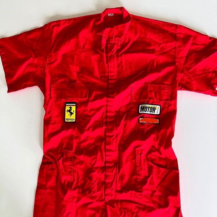 Geveild wordt een prachtige door Ferrari geautoriseerde werkplaats full-face monteursoverall/overall, daterend uit de jaren 90, jaren waarin de monteurs, vooral in de warmere seizoenen, deze overalls droegen om comfortabeler en koeler te blijven, aangezien ze ook korte mouwen.