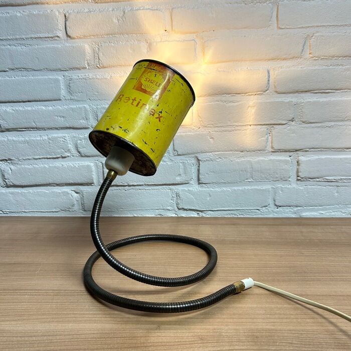 Een unieke handgemaakte PepLamp met antiek Shell olieblik, met een stalen flexibele arm, waardoor hij op verschillende manieren kan worden geplaatst, ook aan de muur.