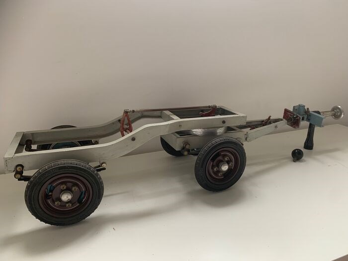 Zeer fraai instructiemodel van een schamel-aanhangwagen chassis met bladvering, veerschommels, oploopremmen en een vangmuilkoppeling.