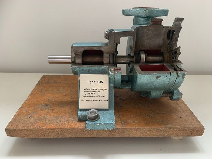 Decoratief, opengewerkt lesmodel van een zelfaanzuigende pomp voor schone vloeistoffen van Stork.