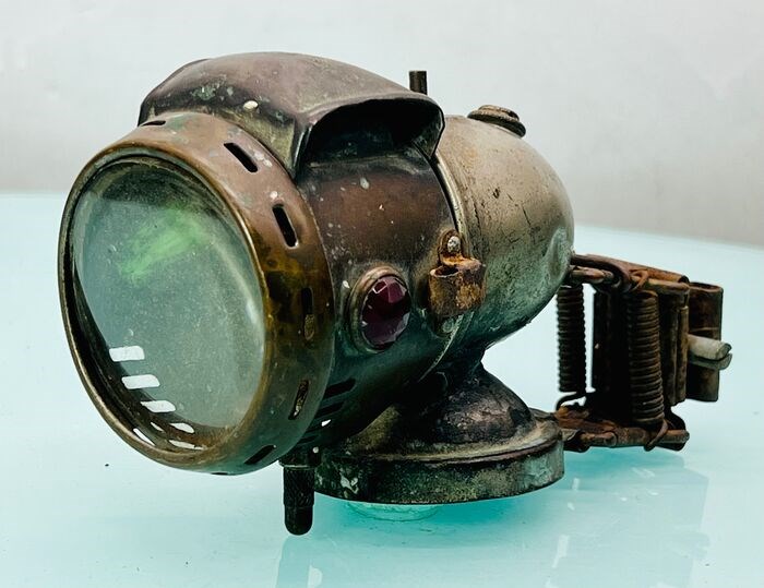 Oude carbide fakkel uit de 19e eeuw gebruikt in de eerste auto's en motorfietsen. Deze lantaarns kunnen voor voertuigen of voetgangers zijn omdat ze draagbaar zijn. Ze zijn in goede staat behalve het grootste glas.