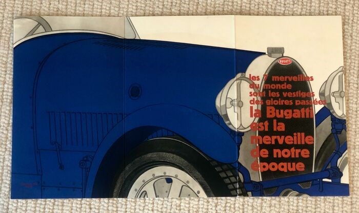 Dit is een opmerkelijke kleine poster van een blauwe Bugatti, gedrukt door Draeger, Parijs, die enkele van de meesterwerken van de Franse grafiek publiceerde. Het is een getipte afdruk uit een uitgave uit 1928 van "Arts et Metiers Graphiques" en bestaat uit 3 uitklapbare panelen.