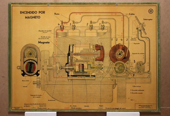 Educatief paneel / mechanisch schema: Ontsteking door magneto. Aanpassing van de Army School of Motoring, Madrid 1943 (Richard Carl Schmidt & Co.)