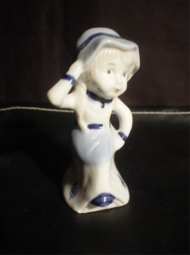 Beeldje van meisje met hoed in kleding van rond 1850 .