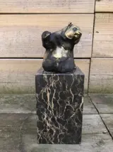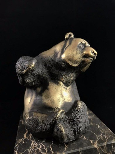 Een bronzen beeld/sculptuur van een zittende panda, op mooie grote voet