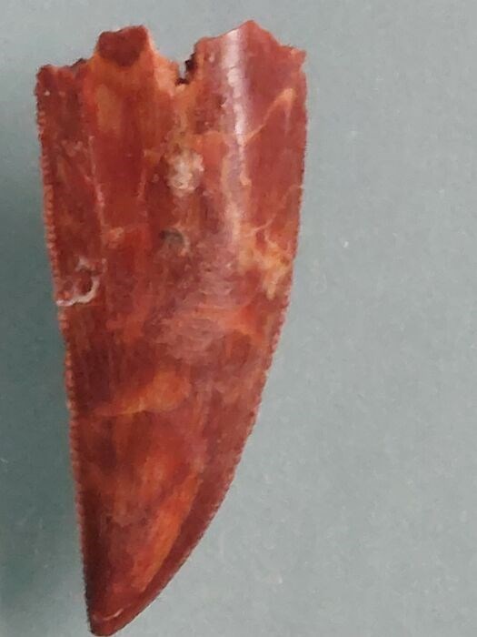 Fossiel: Absolute ZELDZAAMHEID, extreem grote 29 mm perfect bewaarde gekartelde tand van de roofzuchtige dinosaurus Carcharodontosaurus