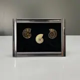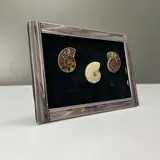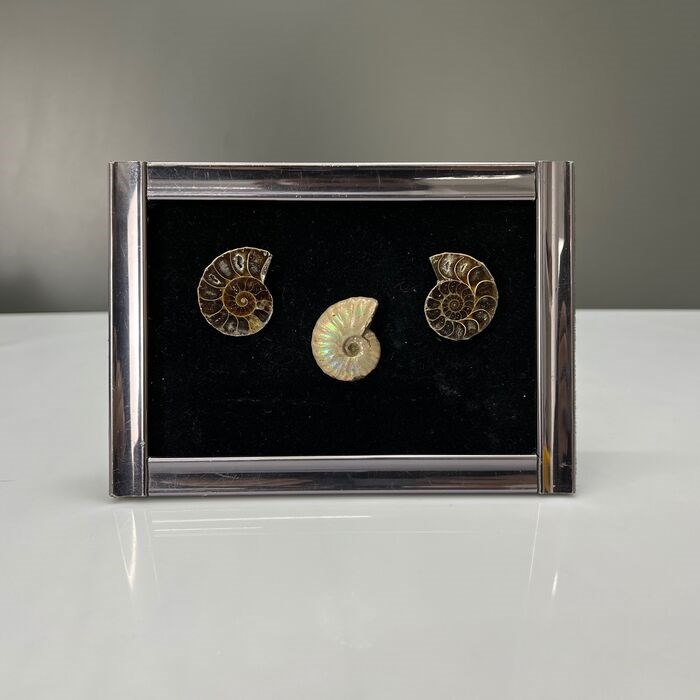 Ze zijn aan het frame bevestigd voor een decoratief display. Deze ammonieten werden gedolven in Marokko. Alle drie uniek en in zeer goede staat.