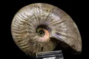 Deze prachtige ammoniet met de gladde gestreepte schelp en dunne vorm is een Cleoniceras uit het Jura van Madagascar die nog de originele iriserende schelp in parelmoer heeft, dit is de beste kwaliteit gewonnen in Madagaskar.