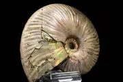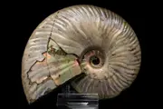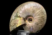 Deze prachtige ammoniet met de gladde gestreepte schelp en dunne vorm is een Cleoniceras uit het Jura van Madagascar die nog de originele iriserende schelp in parelmoer heeft, dit is de beste kwaliteit gewonnen in Madagaskar.