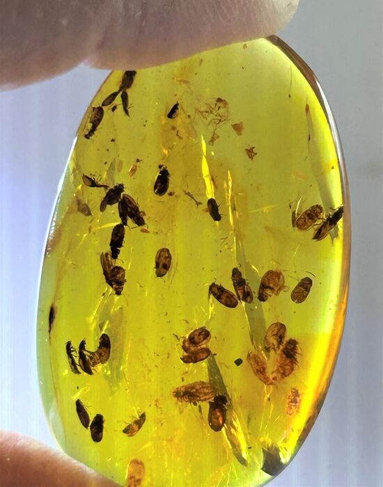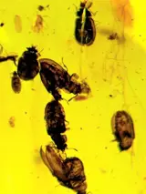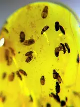 Ongeveer 30 Coleoptera werden in deze barnsteen gewikkeld. De grootte van de kever is ongeveer 2 ~ 3 mm. De barnsteen zelf is heel helder, dus elke Coleoptera is direct met het blote oog te zien. Zoals je op de foto kunt zien, behouden verschillende Coleoptera nog steeds hun glanzende dekschilden en lichaam. Wat de barnsteen betreft, is dit insectenfossiel goed bewaard gebleven, maar er zijn enkele ijspatronen in de barnsteen. Als je het erg vindt, download het dan niet. markering.