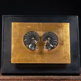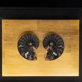 Een prachtige zwarte ammoniet van de soort Cleoniceras van Madagaskar, met karakteristieke mineralisaties zichtbaar in de sektarische kamers.