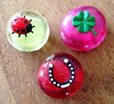 Deel je geluk door dit doosje met drie leuke geluksbrengers bijvoorbeeld aan iemand te geven die dat wel kan gebruiken. Een hoefijzer, een klavertje vier en een lieveheersbeestje sieren deze mooie gekleurde glassteentjes.