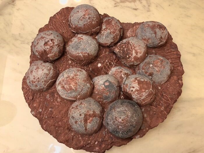 Zeer zeldzaam dinosauruseierennest, in totaal 14 dinosauruseieren! De opstelling lijkt sterk op die van paleontologen. De organismen van vandaag vinden mogelijk geen eiernesten in deze opstelling. We hebben er eentje opgeruimd (foto 2), waardoor deze eieren nog mooier kunnen!