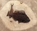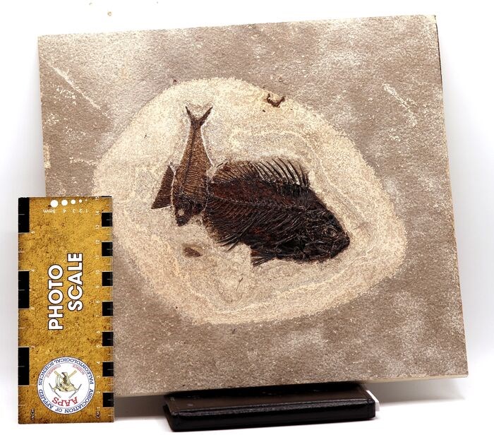 Deze Priscacara vis heeft zelf een afmeting van 13 cm. Het is goed gecentreerd op een kalkstenen plaat van 27,5 x 24,5 cm.